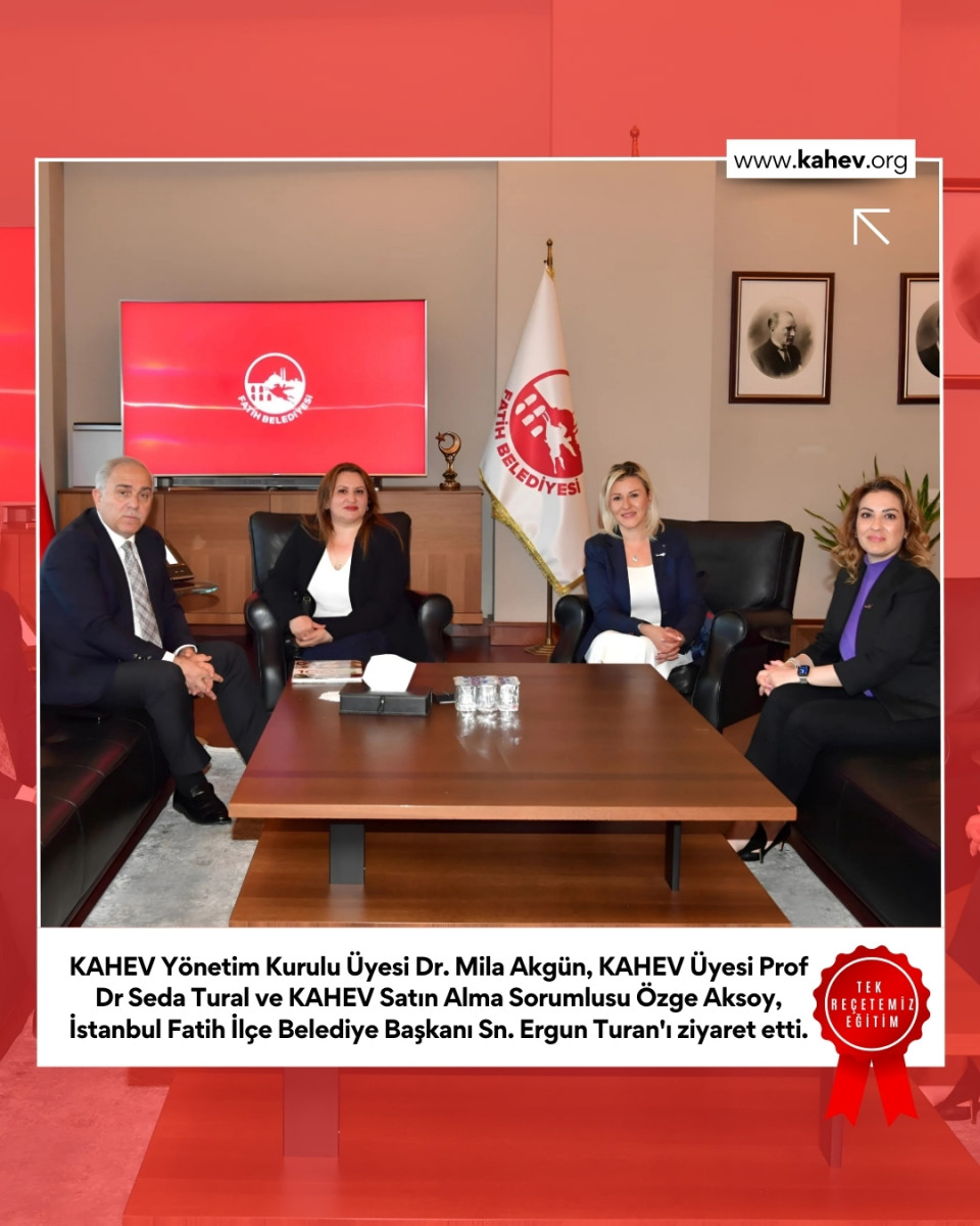 KAHEV Yönetim Kurulu Üyesi Dr. Mila Akgün, KAHEV Üyesi Prof. Dr. Seda Tural ve KAHEV Satın Alma Sorumlusu Özge Aksoy, İstanbul Fatih İlçe Belediye Başkanı, Sn. Ergun Turan'ı makamında ziyaret etti. KAHEV olarak ülke genelinde binlerce çocuğumuzun faydasına yaptığımız projelerin anlatıldığı ve ortak paydada birleşebileceğimiz projeler üstüne konuşulan verimli bir toplantı gerçekleştirildi. KAHEV heyetini ağırlayan değerli başkanımıza teşekkür ediyor, eğitimin dönüştürücü gücüne olan inancımızla çalışmalarımıza devam ediyoruz.